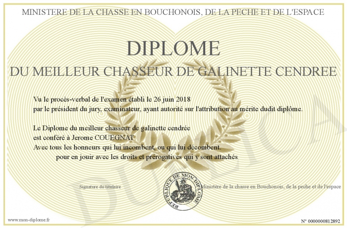 Envoyez par email votre Diplôme du meilleur chasseur de galinette cendrée personalisé