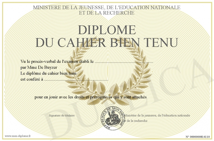 Envoyez par email votre diplôme du cahier bien tenu personalisé