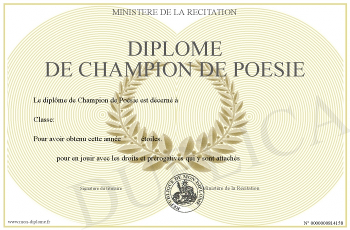 Envoyez par email votre Diplôme de Champion de Poésie personalisé