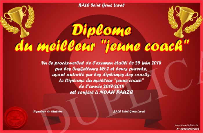Envoyez par email votre Diplôme du meilleur -jeune coach- personalisé
