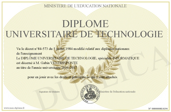 Envoyez par email votre Diplôme universitaire de technologie personalisé