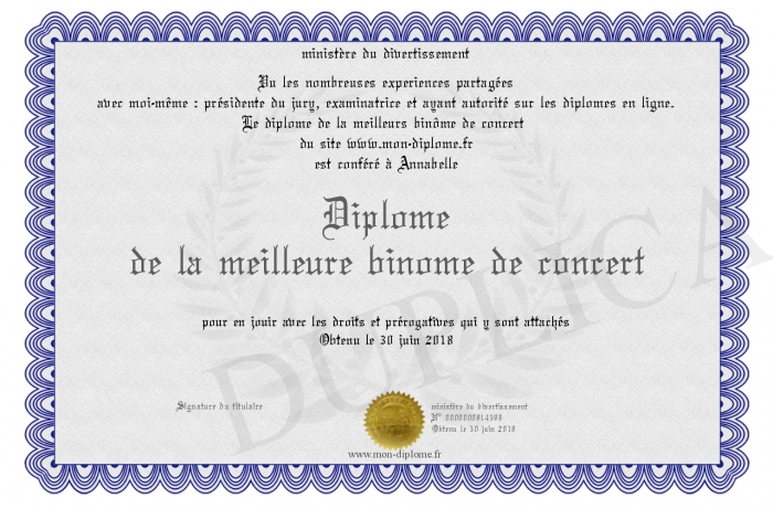 Envoyez par email votre Diplôme de la meilleure binôme de concert personalisé