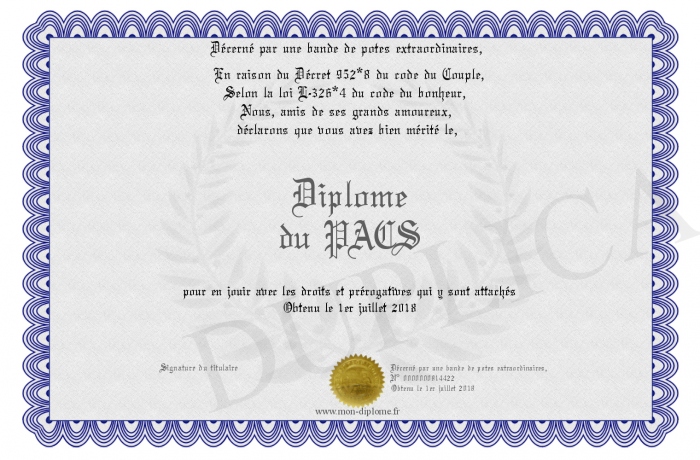 Envoyez par email votre Diplôme du PACS personalisé