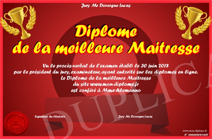 Envoyez par email votre Diplome de la meilleure Maitresse personalisé