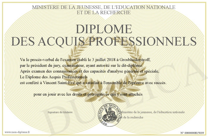 Envoyez par email votre Diplôme des Acquis Professionnels personalisé