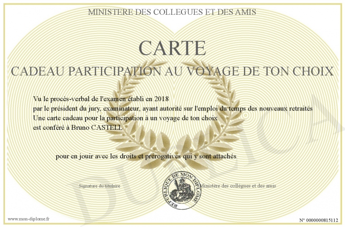 Envoyez par email votre CARTE cadeau participation au voyage de ton choix personalisé