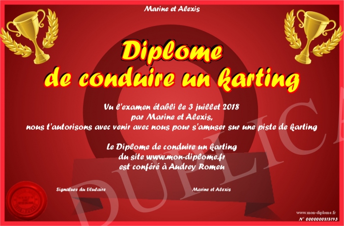 Envoyez par email votre Diplôme de conduire un karting personalisé