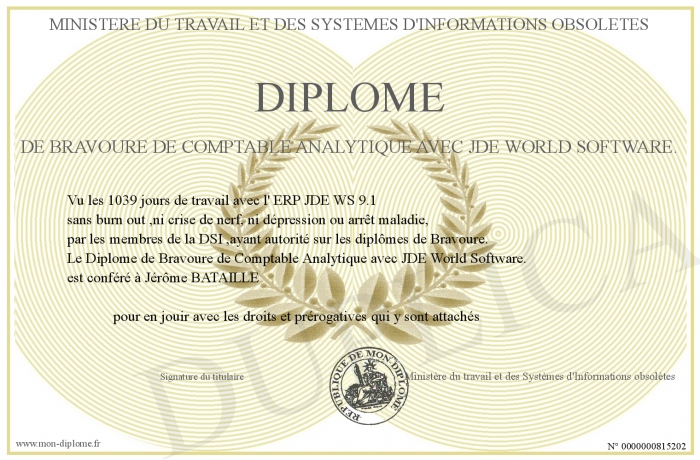 Envoyez par email votre Diplôme de Bravoure de Comptable Analytique avec JDE World Software. personalisé