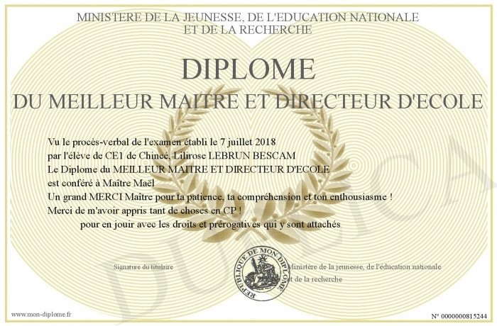 Envoyez par email votre Diplôme du MEILLEUR MAITRE ET DIRECTEUR D'ECOLE personalisé