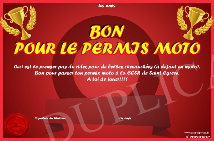 Envoyez par email votre BON POUR LE PERMIS MOTO personalisé