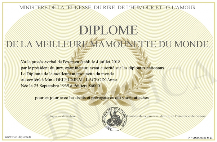 Envoyez par email votre Diplôme de la meilleure mamounette du monde. personalisé