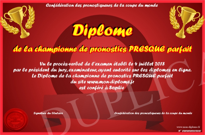 Envoyez par email votre Diplôme de la championne de pronostics PRESQUE parfait personalisé