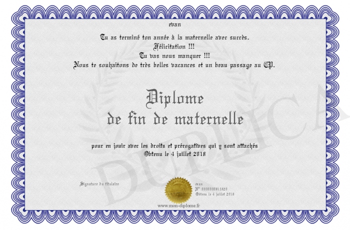 Envoyez par email votre Diplôme de fin de maternelle personalisé