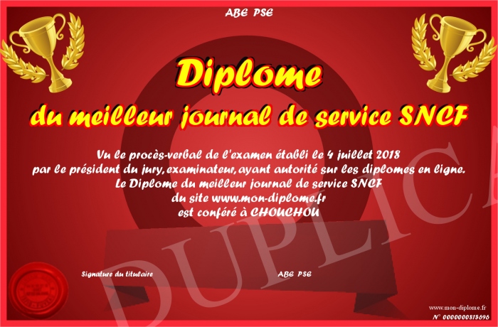 Envoyez par email votre Diplôme du meilleur journal de service SNCF personalisé