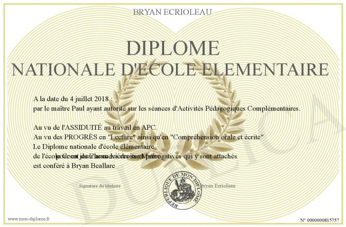 Envoyez par email votre Diplôme nationale d'école élémentaire personalisé