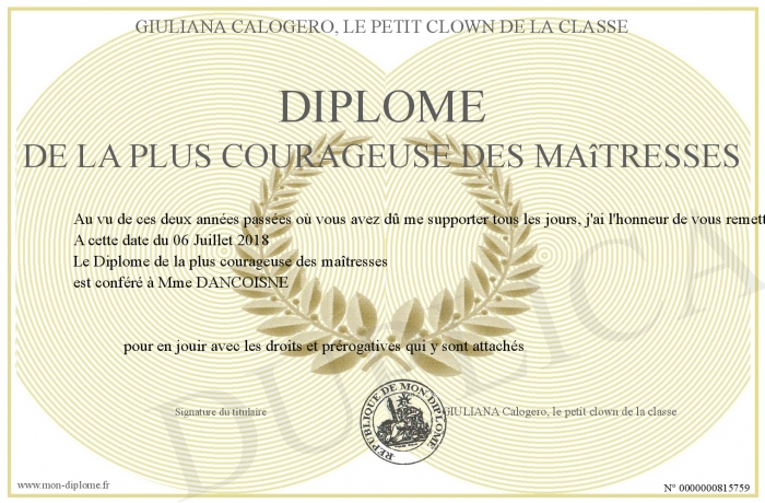 Envoyez par email votre Diplôme de la plus courageuse des maîtresses personalisé