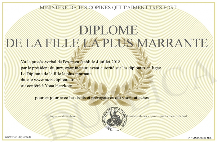 Envoyez par email votre Diplôme de la fille la plus marrante personalisé
