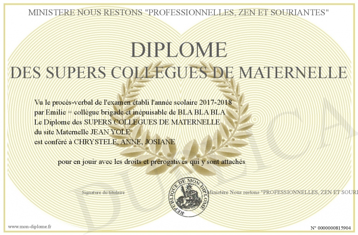 Envoyez par email votre Diplôme des SUPERS COLLEGUES DE MATERNELLE personalisé