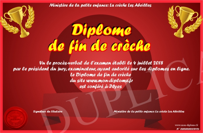 Envoyez par email votre Diplôme de fin de crèche personalisé