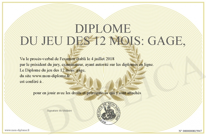 Envoyez par email votre Diplôme du jeu des 12 mois: gage, personalisé