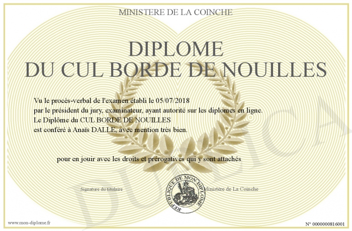 Envoyez par email votre Diplôme du CUL BORDE DE NOUILLES personalisé