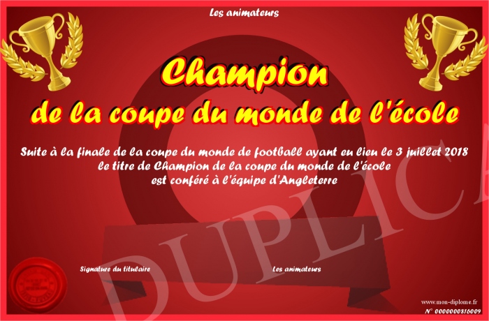 Envoyez par email votre Champion de la coupe du monde de l'école personalisé