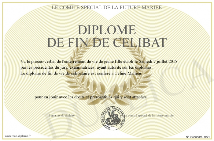 Envoyez par email votre Diplôme de fin de Célibat personalisé