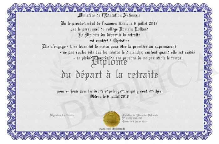 Envoyez par email votre Diplôme du départ à la retraite personalisé