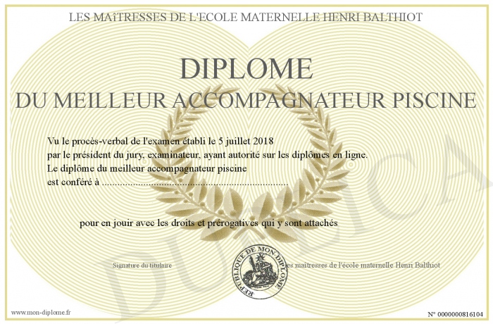 Envoyez par email votre Diplôme du meilleur accompagnateur piscine personalisé