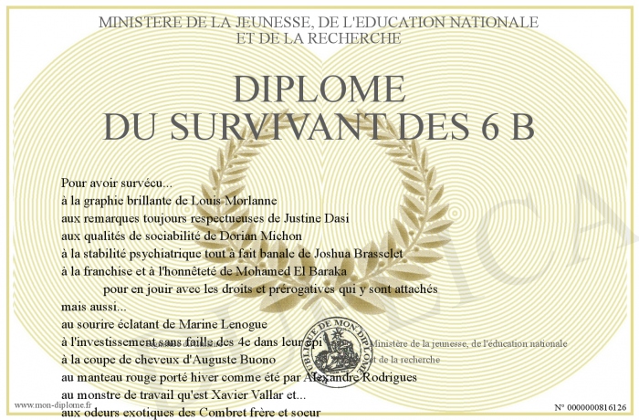 Envoyez par email votre Diplôme du survivant des 6 B personalisé