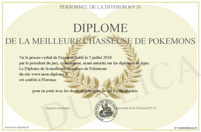 Envoyez par email votre Diplôme de la meilleure chasseuse de Pokémons personalisé