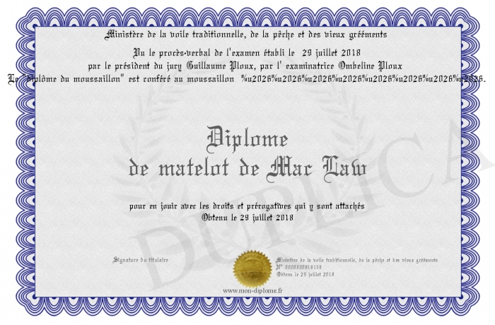 Envoyez par email votre Diplome de matelot de Mac Law personalisé