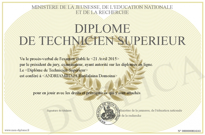 Envoyez par email votre Diplôme de Technicien Supérieur personalisé
