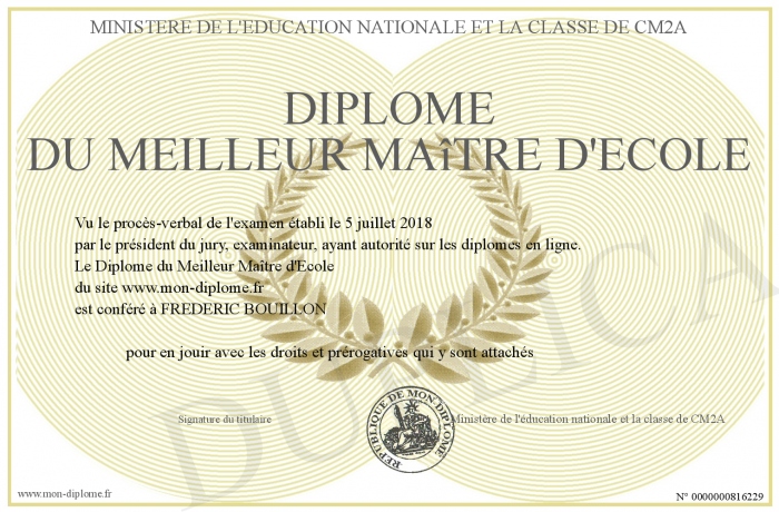 Envoyez par email votre Diplôme du Meilleur Maître d'Ecole personalisé