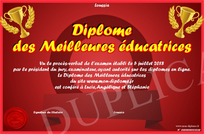Envoyez par email votre Diplome des Meilleures éducatrices personalisé