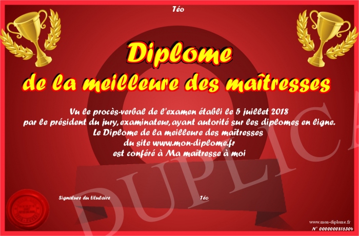 Envoyez par email votre Diplôme de la meilleure des maîtresses personalisé
