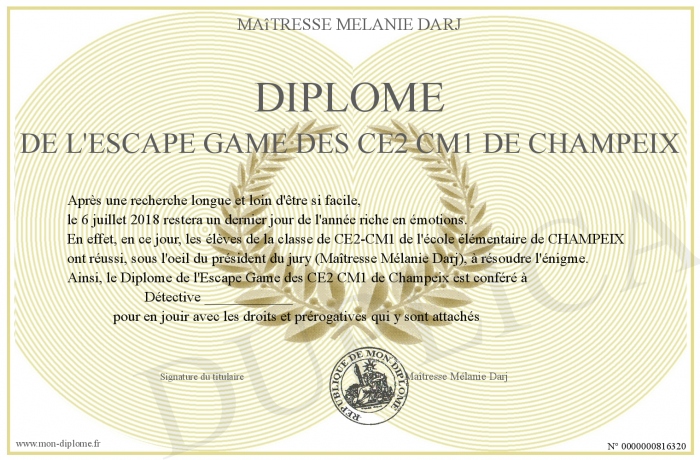 Envoyez par email votre Diplôme de l'Escape Game des CE2 CM1 de Champeix personalisé