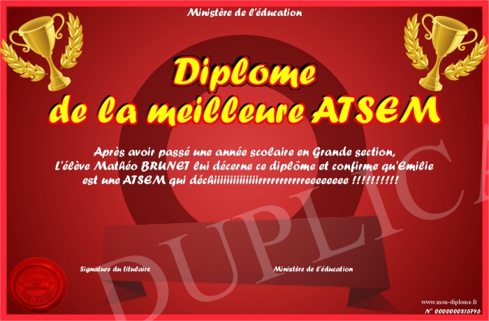 Envoyez par email votre Diplome de la meilleure ATSEM personalisé