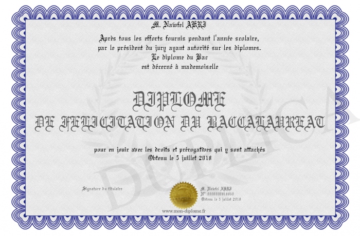Envoyez par email votre DIPLOME DE FELICITATION DU BACCALAUREAT personalisé