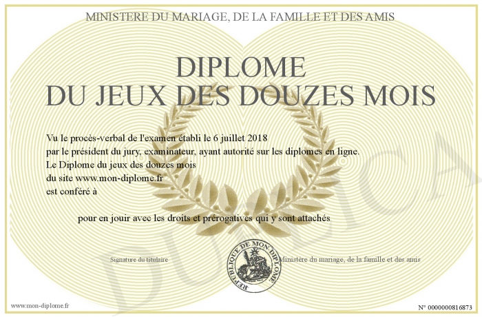 Envoyez par email votre Diplôme du jeux des douzes mois personalisé