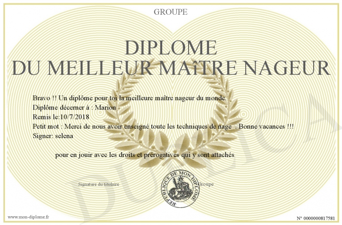 Envoyez par email votre Diplôme du meilleur maître nageur personalisé