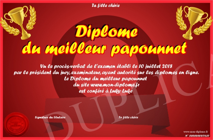 Envoyez par email votre Diplôme du meilleur papounnet personalisé