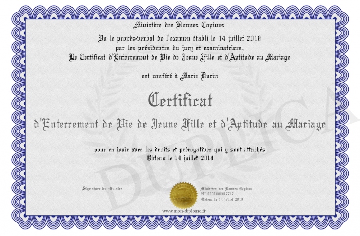 Envoyez par email votre Certificat d'Enterrement de Vie de Jeune Fille et d'Aptitude au Mariage personalisé