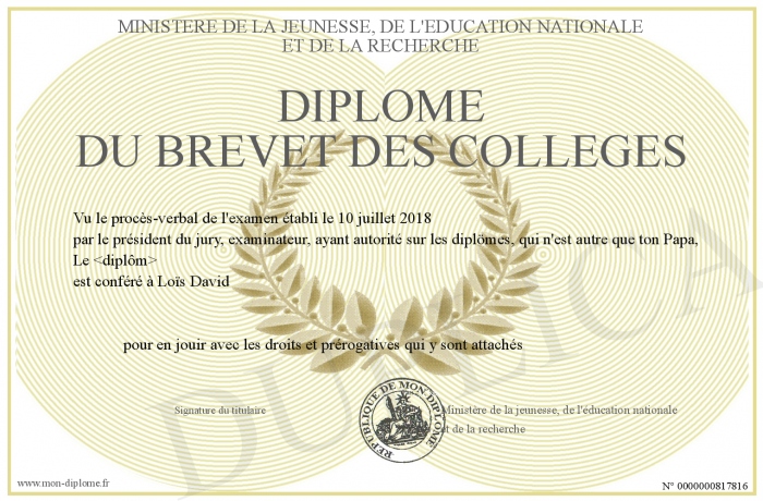 Envoyez par email votre diplôme du brevet des collèges personalisé