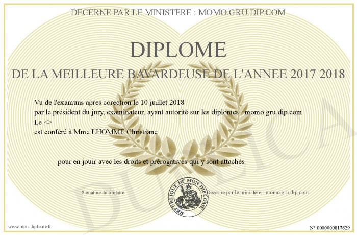 Envoyez par email votre Diplôme de la meilleure bavardeuse de l'année 2017 2018 personalisé