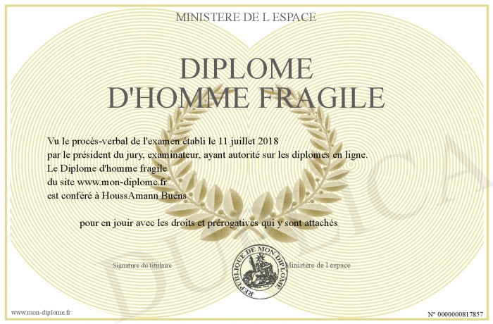 Envoyez par email votre Diplôme d'homme fragile personalisé