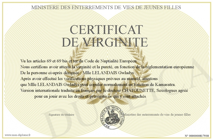 Envoyez par email votre Certificat de Virginite personalisé