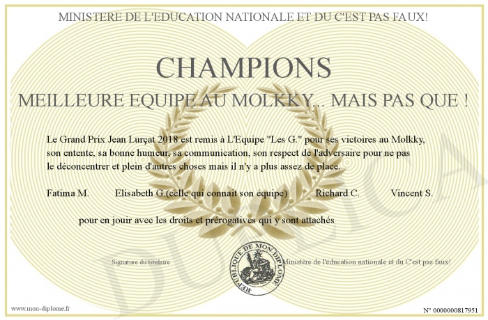 Envoyez par email votre Champions meilleure équipe au Molkky... mais pas que ! personalisé