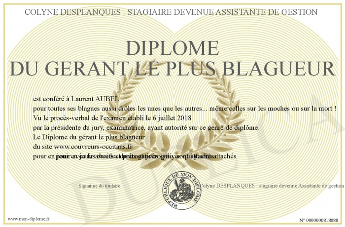 Envoyez par email votre Diplôme du gérant le plus blagueur personalisé