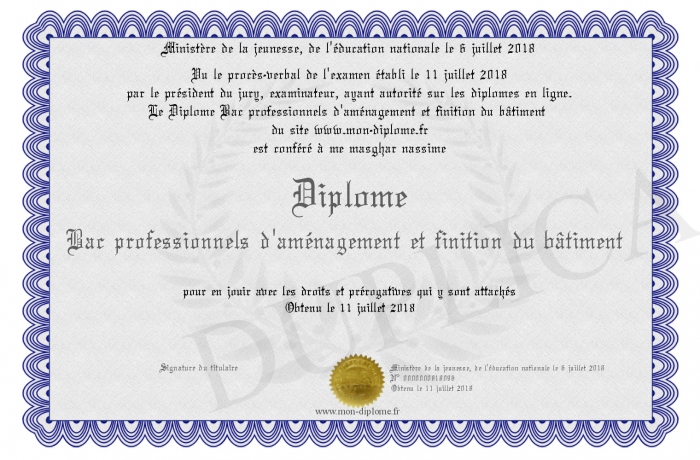 Envoyez par email votre Diplôme Bac professionnels d'aménagement et finition du bâtiment personalisé